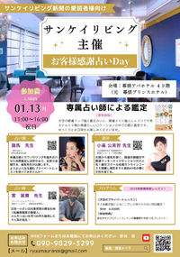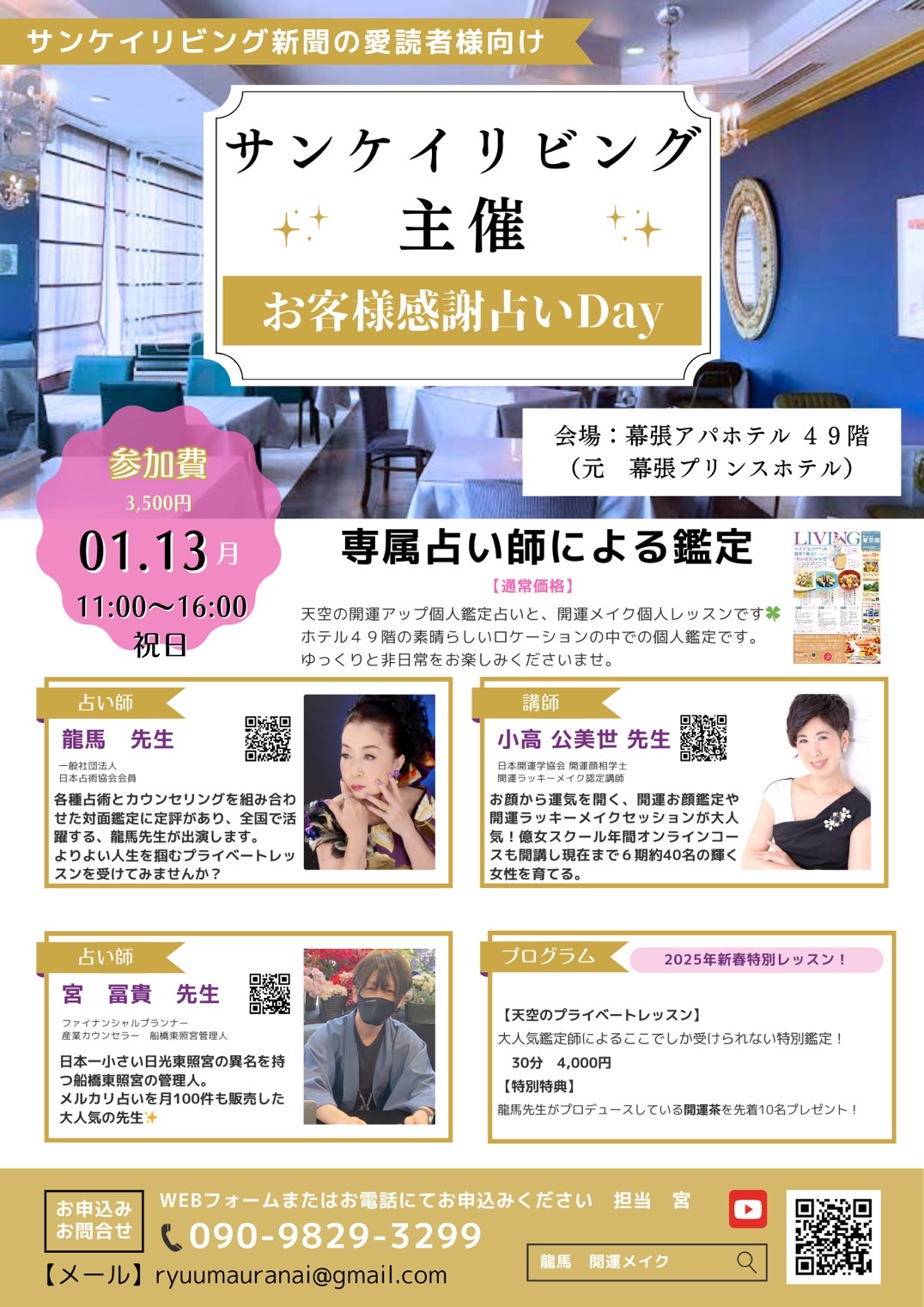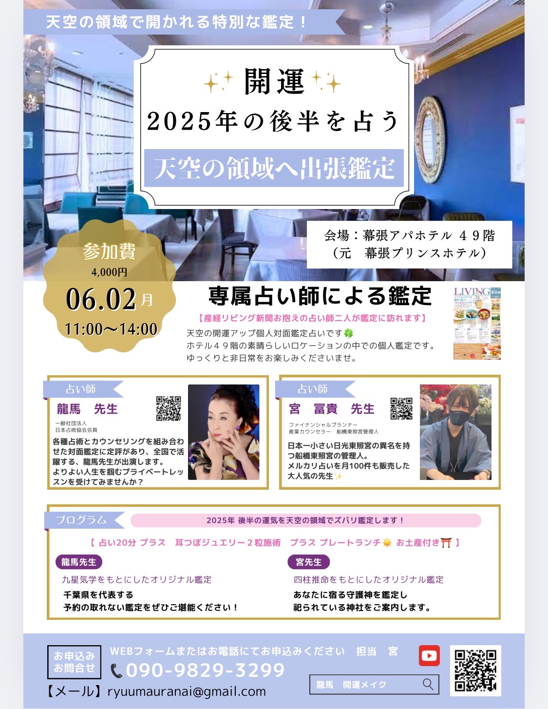 | 幕張アパHOTEL 49Fにて サンケイリビング主催 セルフイメージアップ開運アップの 個人鑑定会があります。 詳細は下記のちらしまで。 |