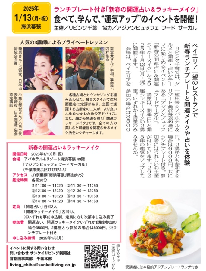 | 幕張アパHOTEL 49Fにて ランチプレート付き 「新春の開運占い&ラッキーメイク」が、 開催されます。 一講座20分(個人鑑定)+ランチプレート ¥3500 詳細お申し込みは、下記ちらしまで。 |