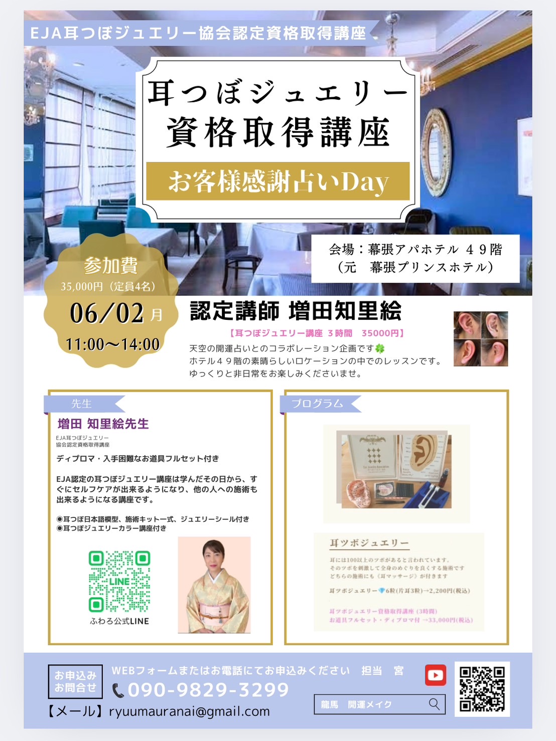 | 【EJA耳つぼジュエリー協会認定資格取得講座】 ディプロマ・入手困難なお道具フルセット付き (耳つぼ日本語模型、施術キット一式、ジュエリーシール付き) 耳つぼジュエリーカラー講座付き EJA認定の耳つぼジュエリー講座は学んだその日から、 すぐにセルフケアが出来るようになり、 他の人への施術も出来るようになる講座です。 金額は 35,000円 ランチ代金は別途 募集は4名 肩書き EJA耳つぼジュエリー協会 認定講師 増田智絵里 お問い合わせ先は、070-4073-1482 龍馬まで |
